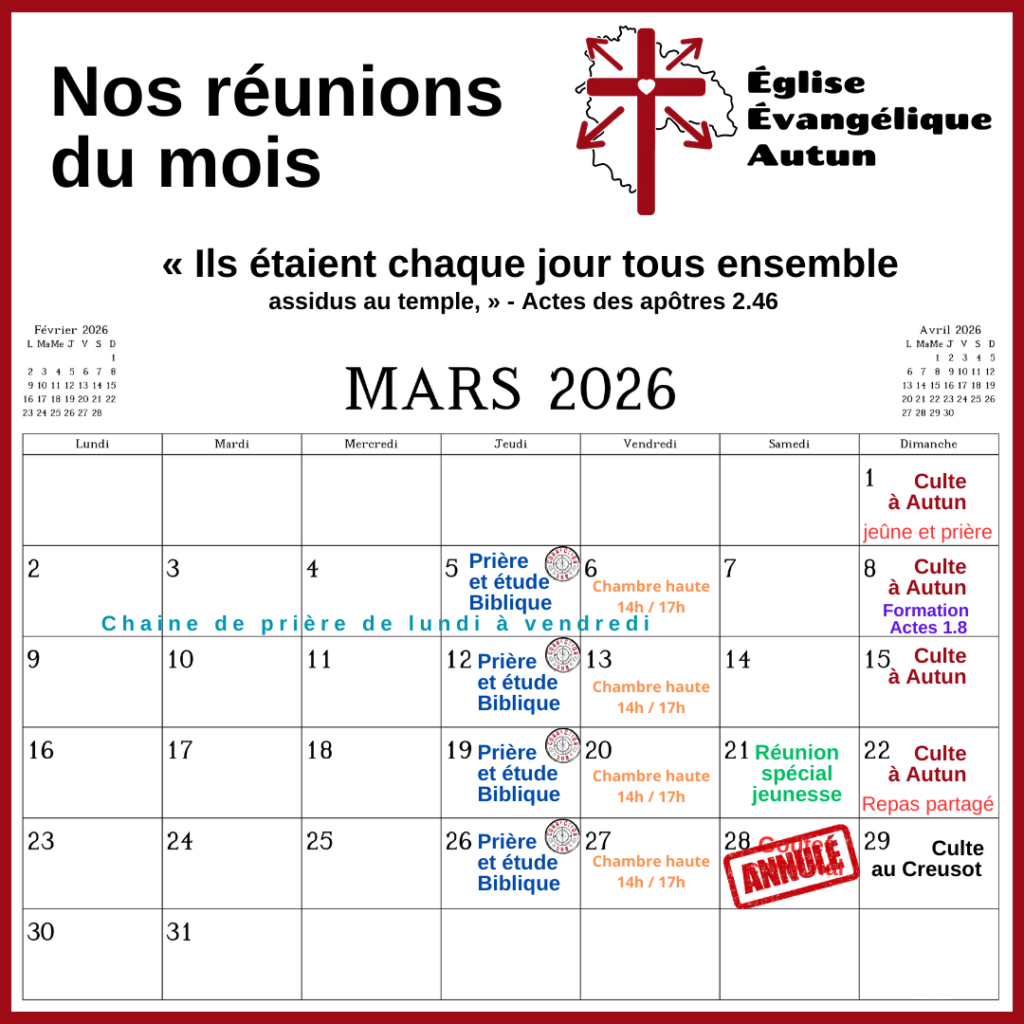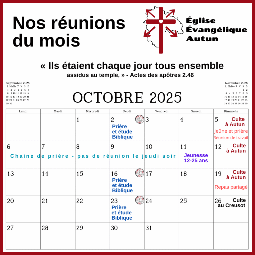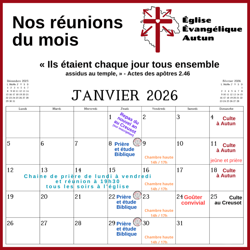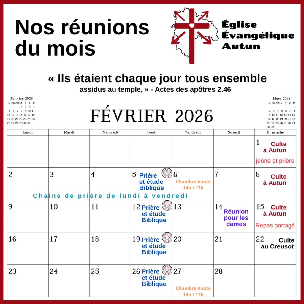 L’église évangélique d’Autun est heureuse de vous accueillir pour partager un temps autour de la prière, de l’étude biblique et du partage fraternel.