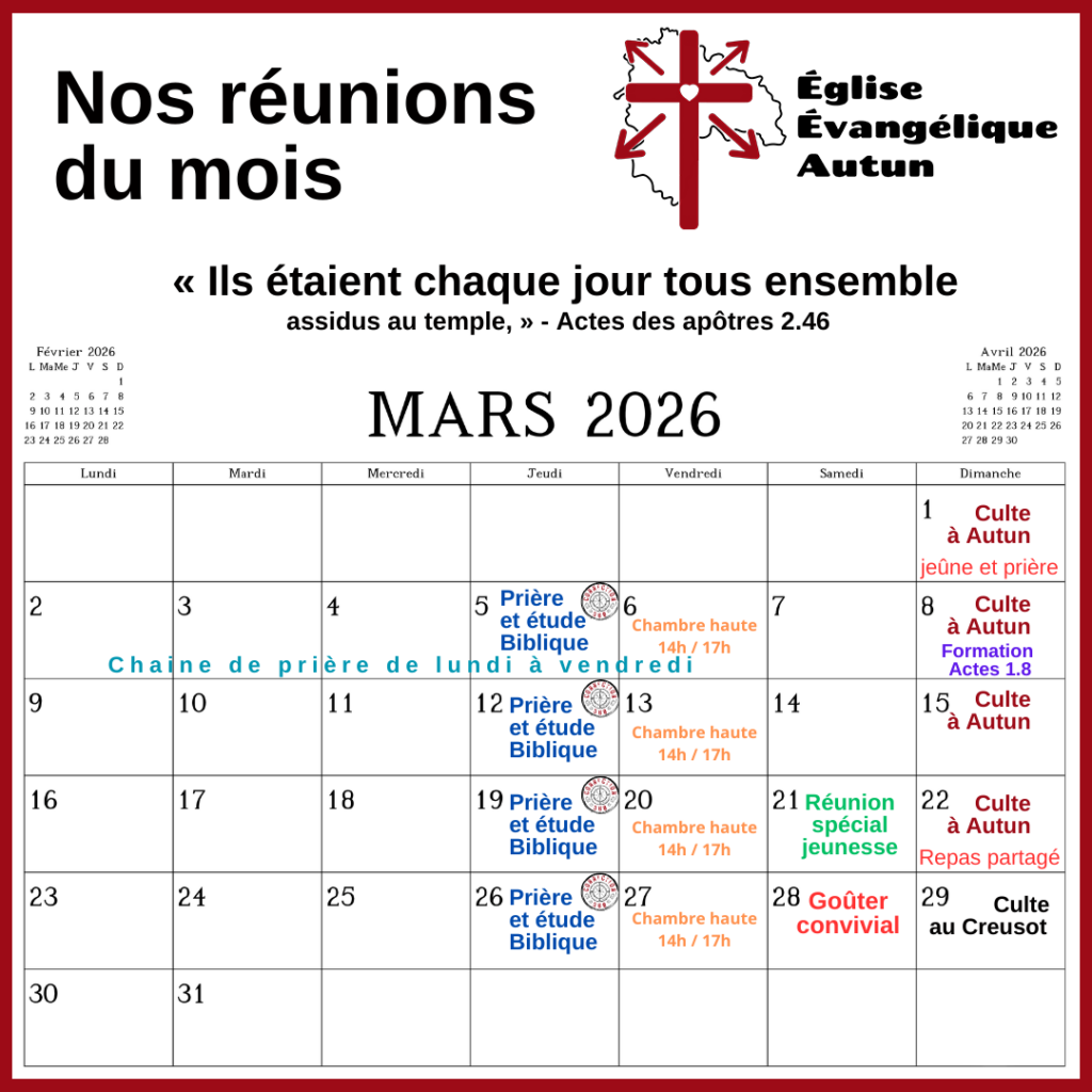 Pour cela nous avons plusieurs type de réunion différent afin que chacun puisse trouver sa place au service de Dieu.